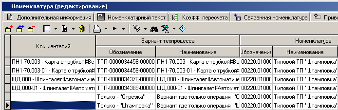 Если у технологического процесса номенклатурной позиции имеются варианты (см. раздел 5.11) то на данной закладке будет отображаться перечень вариантов.