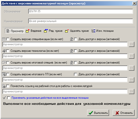 Для удобства работы, когда необходимо быстро создать некоторое количество версий объектов для различных номенклатурных позиций или назначить им большое количество пользователей со своими правами, существует режим групповой работы с версиями.