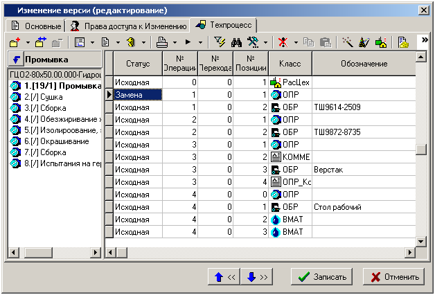 Изменения можно проводить как в соответствующем режиме работы со спецификацией (см. раздел 4.3) или техпроцессом (см. раздел 5.3), так и в соответствующей закладке диалогового окна изменения версии: