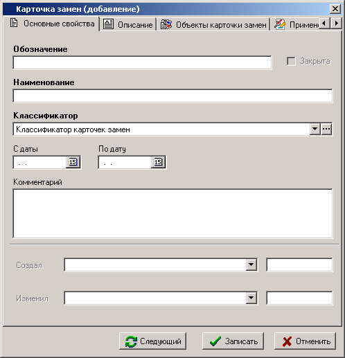 просмотра/редактирования карточки замен содержит дополнительные закладки: |