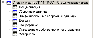 Если в системе уже имеется спецификация на данную номенклатурную позицию, то в информационном поле будет отображено дерево, показывающее разделы данной спецификации.