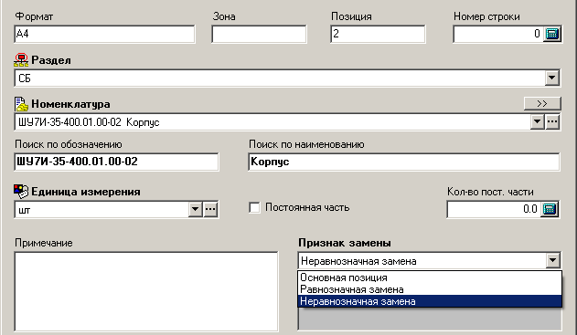 · «Неравнозначная замена». Данная позиция является неравнозначной заменой другой позиции спецификации (например вариантом изготовления детали является разъемное соединение, состоящее из нескольких деталей и эти детали записываются отдельными позициями в спецификации). При указании такой замены в поле «Информация о замене» для основной позиции генерируется комментарий «допуск. замена на поз …», а для деталей варианта «примен. взамен поз. … ».