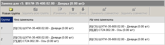 При этом в левой части окна выводятся позиции спецификации (вверху основные, внизу замены), а в правой части вверху указывается какую позицию (либо какие позиции совместно) необходимо заменять, на позиции, указанные в нижнем окне правой части.