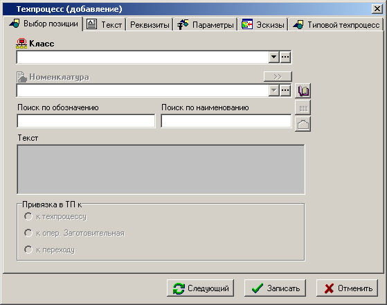 · «Поиск по обозначению» и «Поиск по наименованию» - предназначены для быстрого поиска позиции техпроцесса в номенклатурных справочниках системы.