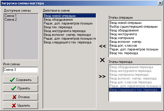 Для создания новой схемы проектирования в поле «Имя схемы» окна настройки мастера прямого проектирования введите ее название. В правой части окна настройки мастера показан список возможных действий пользователя при проектировании ТП. Для удобства, все они разбиты на две основные части - «Этапы операции» и «Этапы перехода».