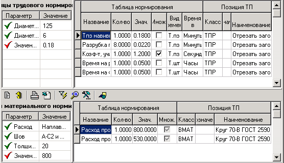 Режим представляет собой две таблицы, у которых в левой части перечислены все нормировочные таблицы, со значениями полученных параметров нормирования, а в правой части - позиции ТП, к которым данные нормировочные таблицы относятся.