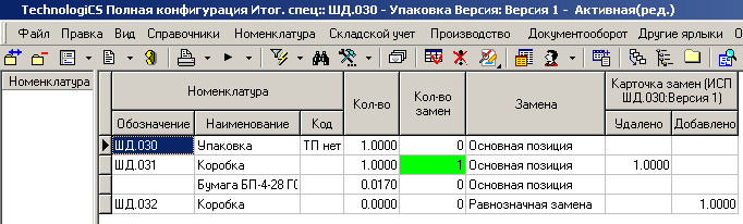 Для отображения наличия примененных замен (см. раздел 8.9) по строке в версии итоговой спецификации, выполните команду