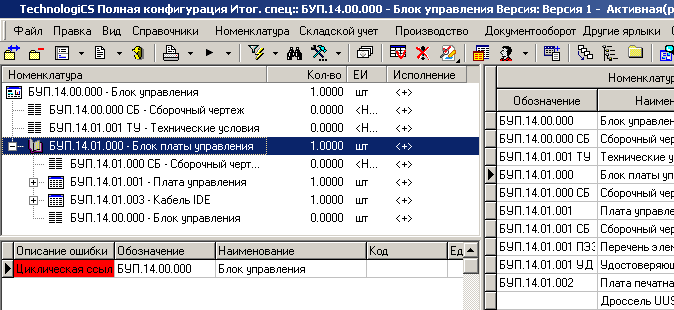 · Когда в процессе ведения состава изделия спецификация включается сама в себя в результате непосредственной или вложенной входимости. Такие ошибки отображаются в специальном окне красным цветом. Такая ошибка является критической и использовать итоговую спецификацию с такой ошибкой нельзя.