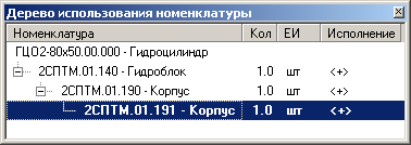 В отдельном окне в виде дерева выдается информация о применяемости текущей позиции в узлах изделия относительно головной спецификации.