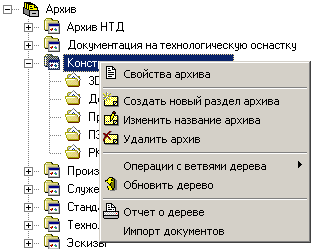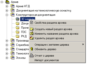 Для выполнения операций с созданным разделом архива следует установить курсор на его наименование в дереве и нажать правую клавишу мыши.