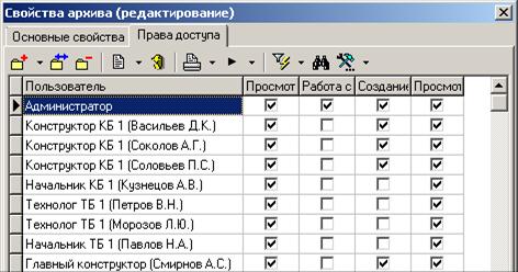На закладке «Права доступа» формируется список пользователей имеющих право работать с архивом.