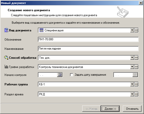 · «Начало контроля» - дата, от которой будет вестись отсчет для расчета сроков достижения контрольных точек выбранного графика разработки документа. Задается если не выбран признак «Задать дату завершения».