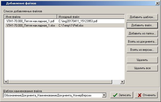 Если шаблон не используется (выбрано значение <нет>), то при добавлении файла, если он существует в файловом составе документа, отображается запрос на перезапись файла.