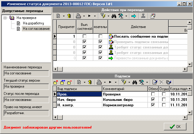 · В нижней правой части отображается список подписей выбранного допустимого перехода. Если на момент подписания документ заблокирован, то в левом нижнем углу будет отображаться информационное сообщение, выделенное красным шрифтом.