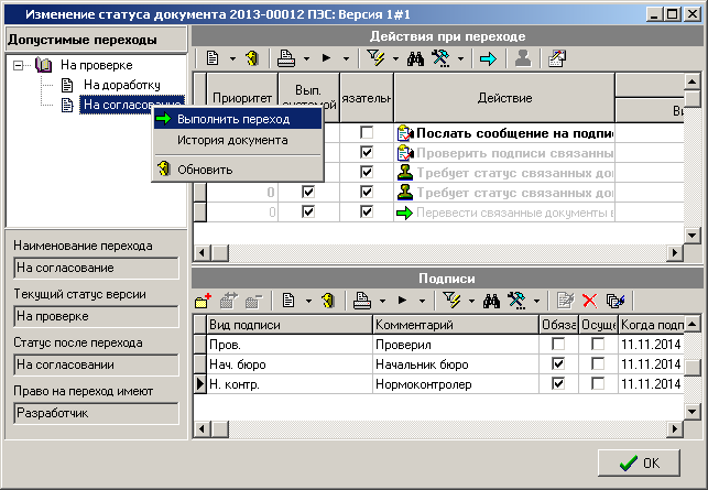Если какое-либо из условий перехода не выполнено, то выдается соответствующее сообщение. Если же процедура проверки успешно завершена, то выполняется переход и в дереве переходов выводится новый установленный статус.