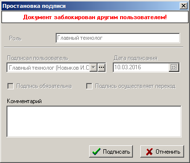 Если на момент подписания документ заблокирован, то в верхней части окна будет отображаться информационное сообщение, выделенное красным шрифтом.