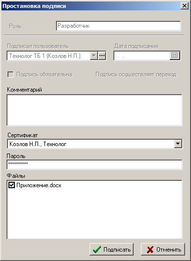 В случае если подпись пользователя подтверждается цифровым сертификатом (см. раздел 15.6), то необходимо выбрать назначенный пользователю сертификат и ввести пароль электронно-цифровой подписи. Для защиты файлового состава электронно-цифровой подписью необходимо отметить соответствующие файлы в этом же окне.