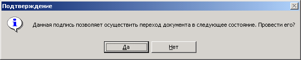 Если у подписи установлено право автоматического перехода (установлен флаг «Осуществлять переход»), то при успешной простановке подписи выдается сообщение: