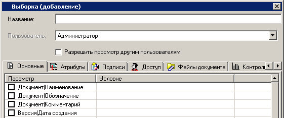 Настройка условий выборки документов по параметрам разнесена на следующие закладки:
