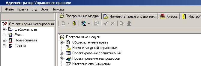 Если запуск выполнен успешно, то система входит в режим «Управление правами». Этот же режим может быть вызван из меню «Файл» - «Управление правами». На экран выдается диалоговое окно следующего вида: