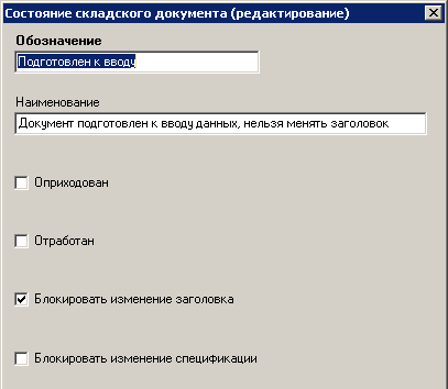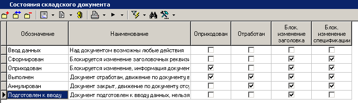 и содержит линейный список состояний складских документов, которые впоследствии будут определять возможности пользователей по работе с документами в данных состояниях.