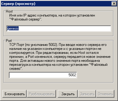 Для изменения значении «Host» и «Port» файлового сервера, предварительно нужно выполнить операцию блокирования сервера (нажать кнопку «Блокировать»).