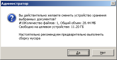 Следует иметь в виду, что такая операция на больших объемах данных может занять продолжительное время, а также - файловый сервер, на который будет производиться перенос, должен быть активен. В противном случае будет выдано соответствующее диагностическое сообщение и операция будет прервана.