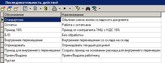 Данный справочник позволяет объединять операции над документом (см. раздел 2.2.3) в последовательности действий, что позволяет существенно повысить скорость обработки складских документов различных типов (см. разделы 2.2.5 и 2.2.6).
