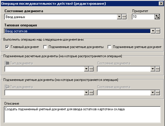 · «Подчиненные расчетные/учетные документы». Блок атрибутов, в котором можно указать конкретный тип подчиненного документа, и/или его состояние, на которое будет распространяться данная операция. Если в данном блоке атрибутов не указаны Тип документа или Состояние документа то Типовая операция будет применена ко всем документам, независимо от их типа или состояния.