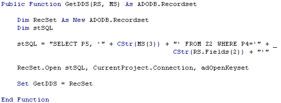 «НаименованиеФункции» - наименование пользовательской функции, которая должна находиться в общем модуле базы данных Microsoft Office Access и описана с ключевым словом Public. Данная функция должна возвращать объект Recordset (библиотеки ADO) с типом курсора Keyset.