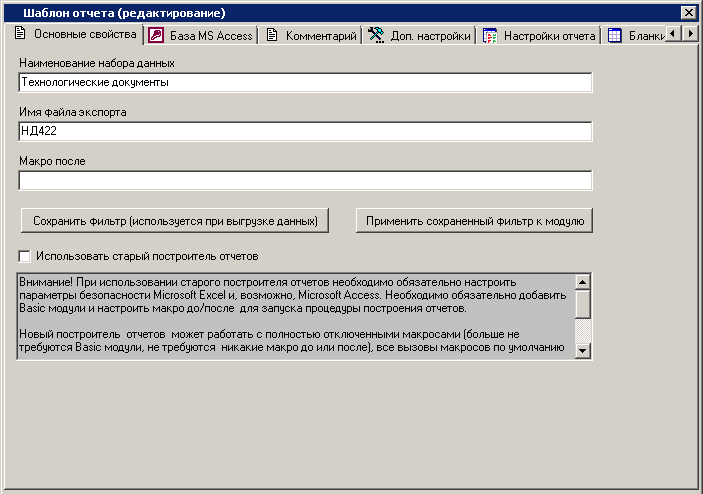 При использовании старого построителя отчетов необходимо обязательно настроить параметры безопасности Microsoft Office Excel и, возможно, Microsoft Office Access. Необходимо обязательно добавить Basic модули и настроить макро до/после для запуска процедуры построения отчетов. Новый построитель отчетов может работать с полностью отключенными макросами (больше не требуются Basic модули, не требуются макро до или после), все вызовы макросов по умолчанию вызывают функции отчета (скрипты TechnologiCS). Если необходимо обеспечить вызов макроса Microsoft Office Excel или OpenOffice Calc необходимо настроить параметры безопасности применяемых программ и в TechnologiCS в поле макро указать префикс «bas:». Вы так же можете вызывать функции Microsoft Office Excel или OpenOffice Calc из макросов TechnologiCS, используя функции построителя отчетов. |
