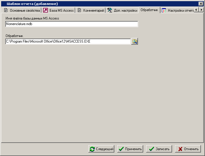 На закладке «Обработчик» в реквизит «Имя файла базы данных MS Access» указывается имя файла создаваемой системой базы данных Microsoft Access, а в реквизит «Обработчик» - наименование внешнего приложения.
