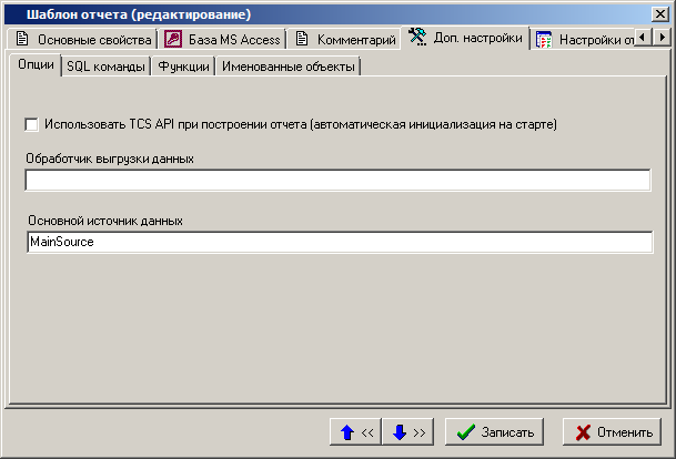 Закладка «Доп.настройки» на форме редактирования выбранного типа набора данных предназначена для обработки данных, которые будут участвовать в формировании выходных документов. К обработке данных относятся создание именованных объектов для внесения в бланки, источников данных для выгрузки данных в бланки, SQL запросы, определение дополнительных переменных для бланков, использование функций API и дополнительных обработчиков выгрузки данных.