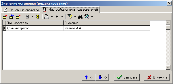 На закладке «Настройка отчета пользователей» определяются значения констант для определенных пользователей. Если пользователь формирующий отчет отсутствует в списке значений констант на закладке «Настройка отчета пользователей», то берется значение константы по умолчанию, указанное на закладке «Основные свойства».
