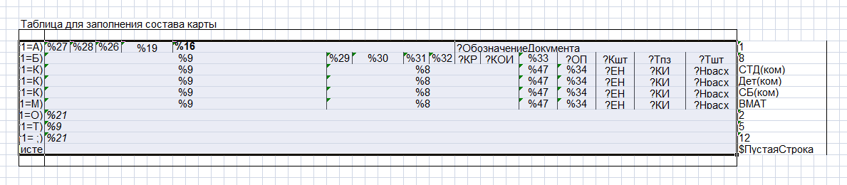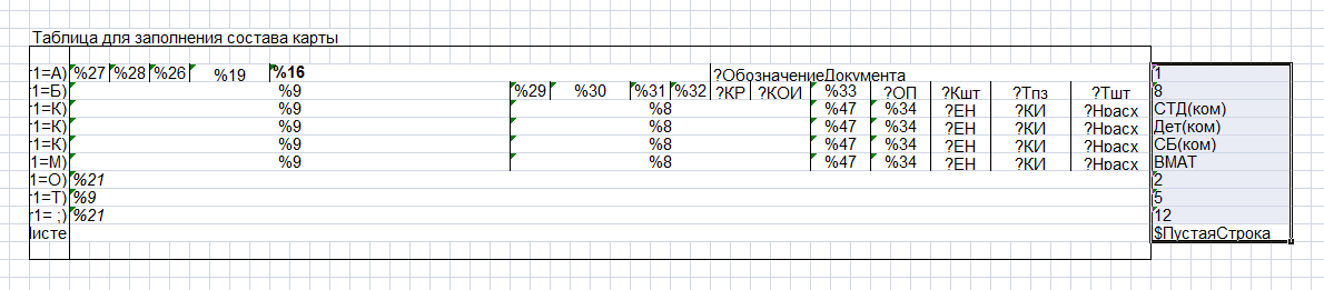 Если такого шаблона строки в таблице нет, то пустые строки формируются на основании строк именованной области «СоставКарты».