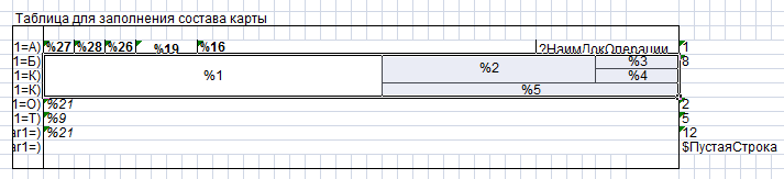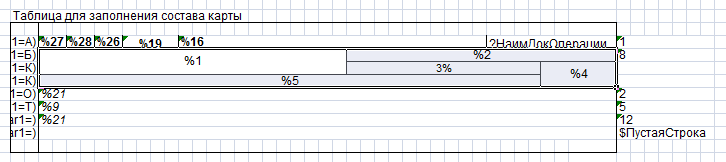 Каждая строка таблицы области заполнения состава карты предназначена для формирования одной или нескольких строк в многострочной части документа. Назовем их шаблонами строк. Они должны иметь одинаковое количество ячеек, совпадающее с количеством ячеек в именованных областях «СоставКарты1» и «СоставКарты2».