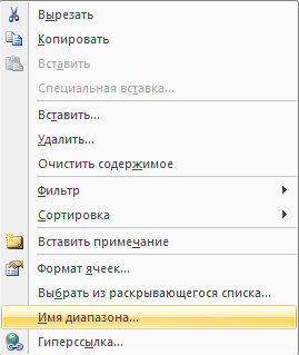 · Правой кнопкой мыши вызовите контекстное меню и выберите команду «Имя диапазона...»