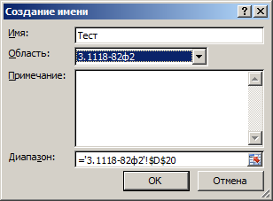 · В появившемся окне введите имя, выберите область «Лист» и нажмите «ОК». Если будет выбрана область «Книга», именованная область будет определена неверно.