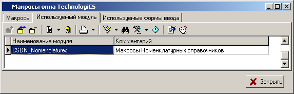Закладка «Используемый модуль» может иметь один модуль, содержащий процедуры макросов, а также дополнительный набор описаний и процедур, собранных в одну программную единицу.