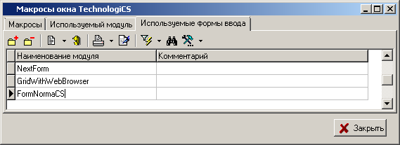 Закладка «Используемые формы ввода» может иметь несколько модулей (форм), содержащих описания расположенных в них визуальных компонентов и кода по работе с ними. Код формы содержит также ряд предопределенных обработчиков событий. В коде формы действуют те же самые правила, что и в обычном скрипте.