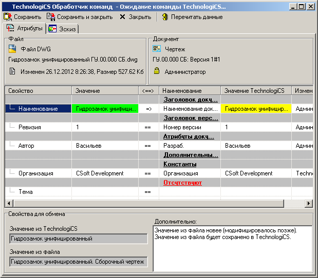 Данный обработчик позволяет передать и использовать свойства TechnologiCS в файле приложения (например обозначение, наименование, разработчик, организация), а также сохранить в документе TechnologiCS для последующей работы заполненные в приложении свойства файла (например формат).