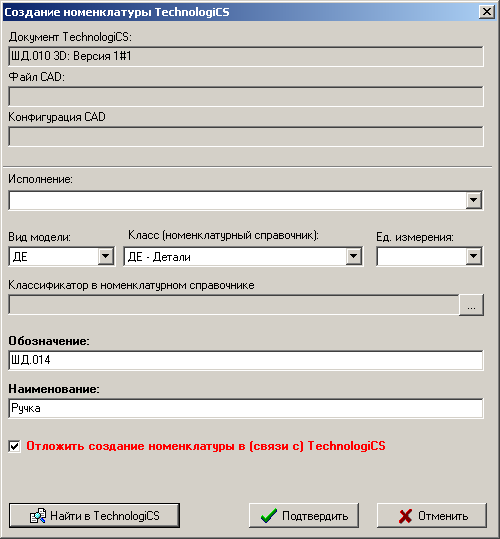 (номенклатурная позиция не создается в в TechnologiCS). Данная номенклатура будет создана в TechnologiCS автоматически при выполнении команды