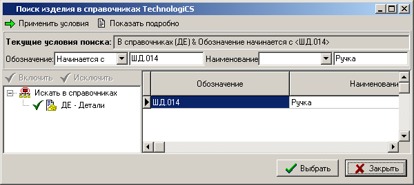 Блок «Текущие условия поиска» используется для изменения условий поиска номенклатурной позиции в заданных справочниках TechnologiCS.