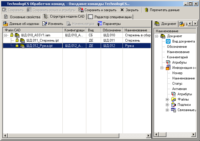 · В левой части отображается форма со структурой модели (входимости файлов первого уровня), построенной на основе данных CAD системы.