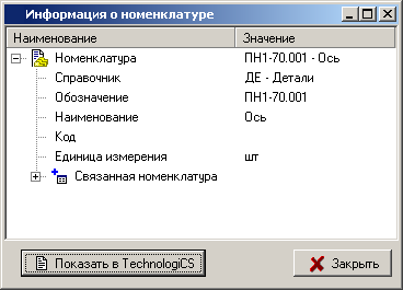 номенклатуре» - отображает окно с информацией о связанной