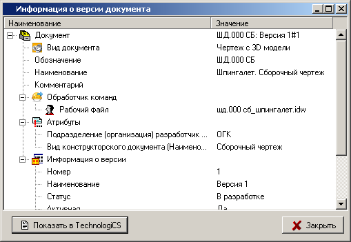 отображает информацию о версии документа в окне TechnologiCS.