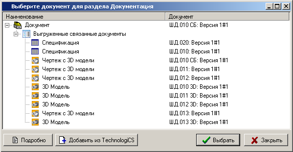 иметь данные об изделии)» - отображает окно с выбором версии документа из