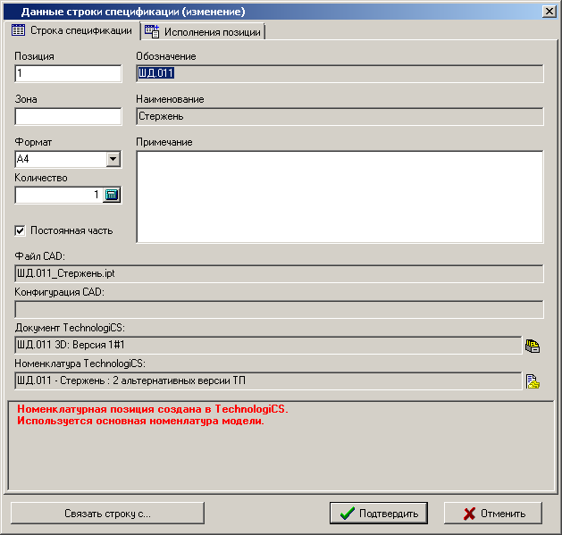 При наличии связи с номенклатурной позицией TechnologiCS, изменение недоступно. |