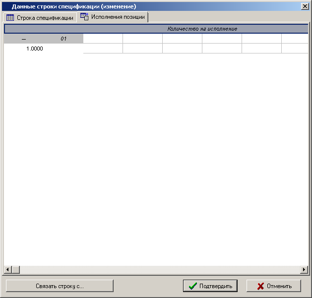 На закладке «Исполнения позиции» отображается таблица с исполнениями на специфицируемое изделие. Данная таблица предназначена для ввода у текущей записи количества переменной части на каждое исполнение.