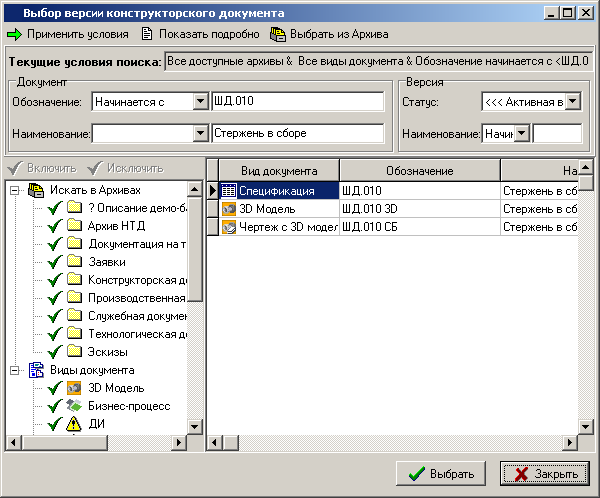 Блок «Текущие условия поиска» используется для изменения условий поиска версии документа в архивах TechnologiCS.